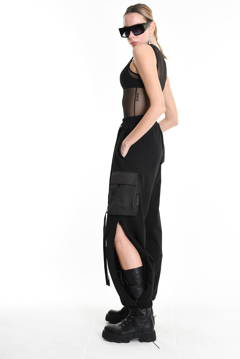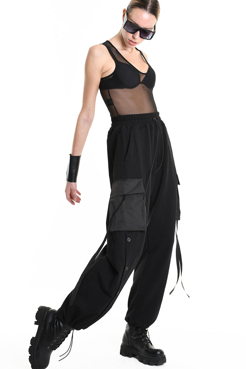 Experience comfort and style with these wide-fit trousers crafted from stretch fleece and detailed with embossed nylon pockets. Designed with an elastic waistband and adjustable drawstrings at both the waist and hem, they provide a perfect fit and versatile look. Side buttons add a subtle edge, while the Italian craftsmanship ensures quality and durability. Ideal for a chic yet relaxed outfit, these trousers blend functionality and fashion effortlessly.
