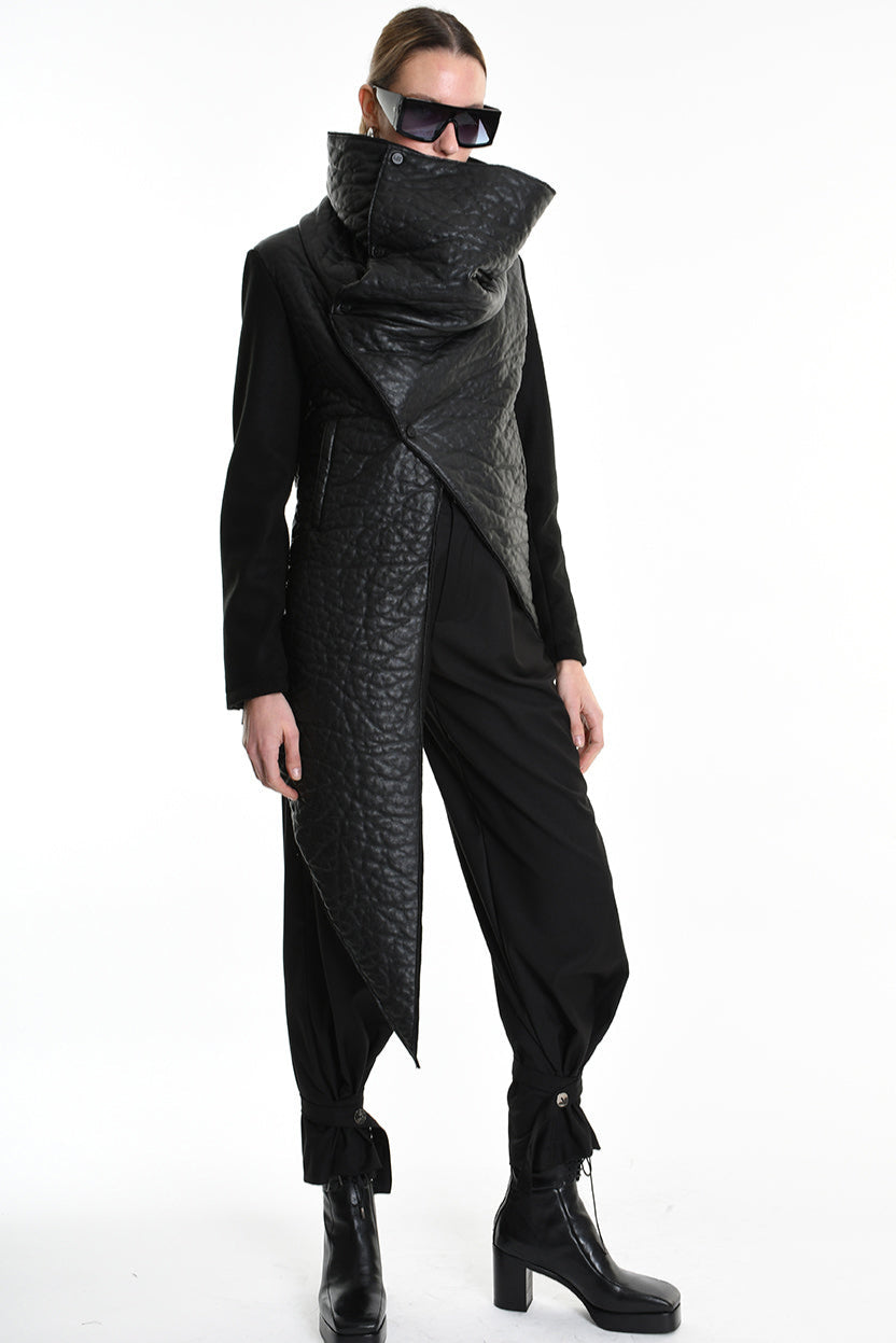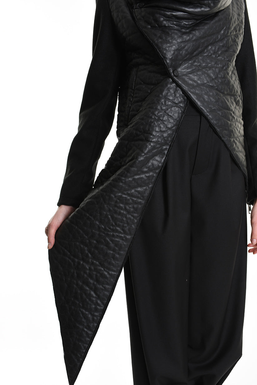 This asymmetric jacket combines 600g crumpled eco-leather with wool lining for warmth and style. Featuring cloth sleeves with zippered cuffs and a button closure, it offers a unique, edgy look while ensuring comfort. Made in Italy with high-quality fabrics, this black jacket is perfect for those seeking a bold yet refined outerwear piece.