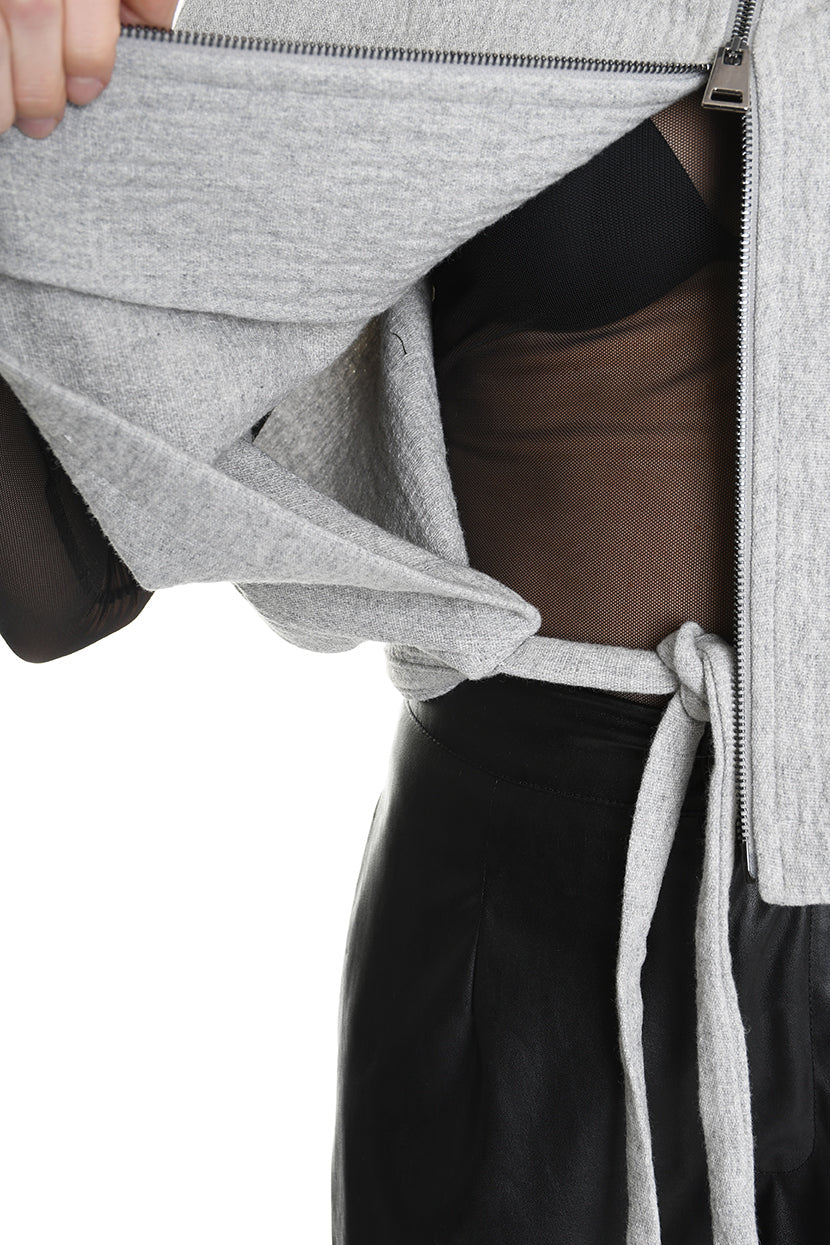 This asymmetric grey cape, made in Italy from an embossed wool blend, combines unique texture with practical design. Featuring a double-slider zip closure, it offers easy wear and adjustable comfort. Its distinctive silhouette and high-quality fabric make it a stylish and versatile addition to any wardrobe.