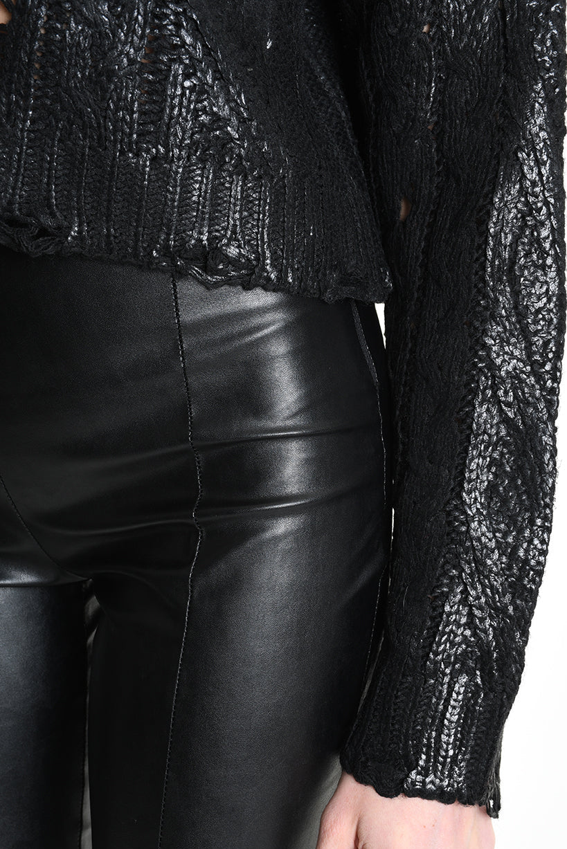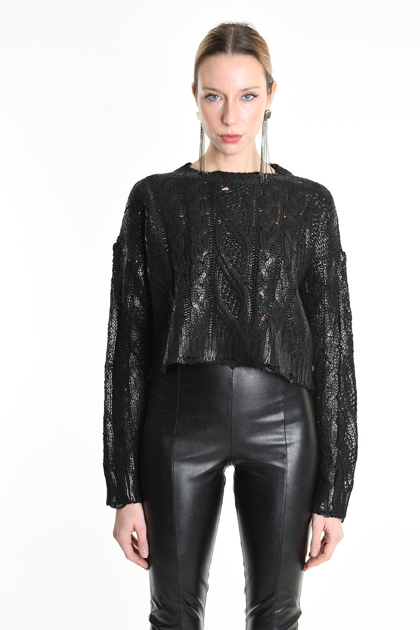 This black cropped cable-knit sweater, crafted in Italy with a fine gauge 3 yarn, combines style and texture through its braided design and unique coated finish with intentional breakages. Its tailored fit enhances your silhouette, making it a versatile piece for chic, contemporary looks. Modeled here in size XS, it suits those seeking a modern, edgy knitwear essential.