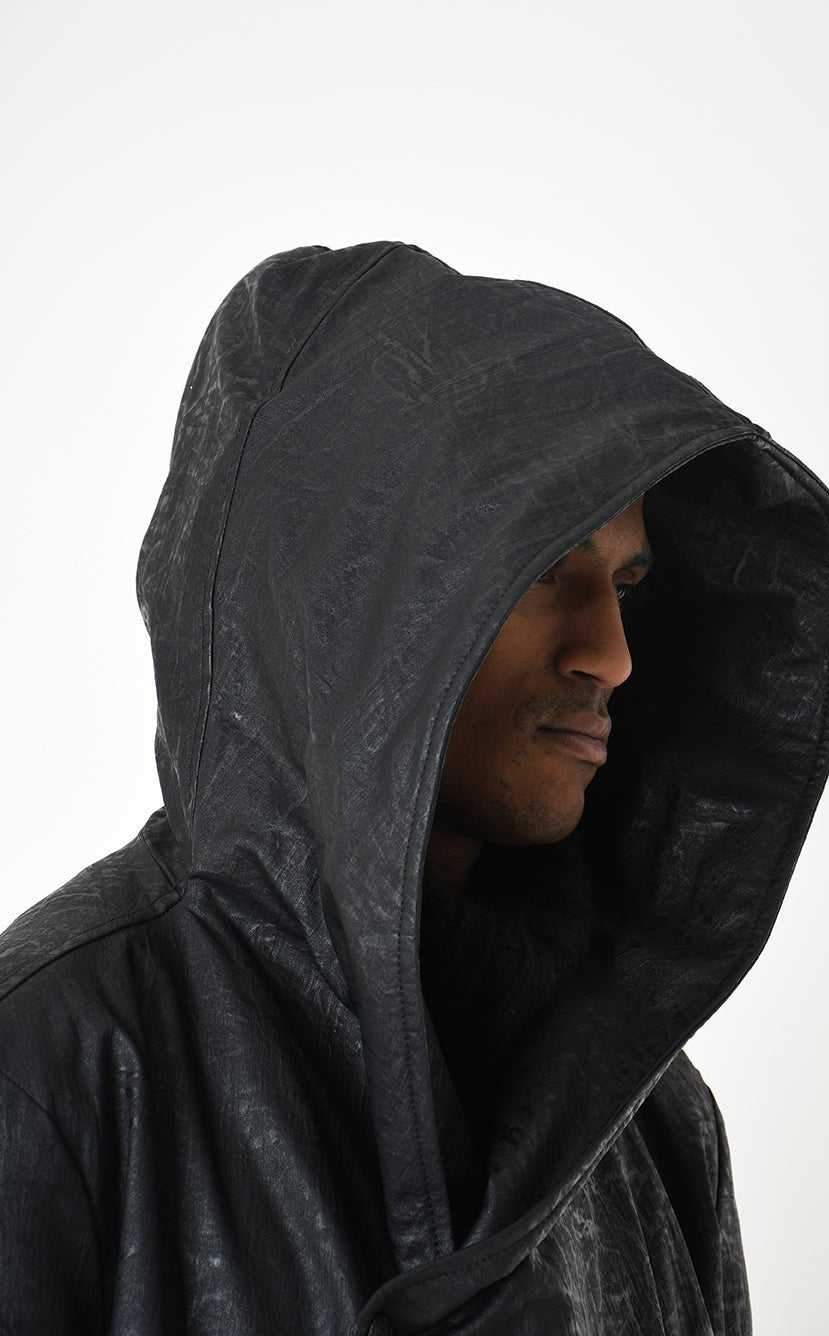 Indulge in luxury with the A33P LM24925 COAT. Crafted from graphite faux leather, this long comfort coat features a padded 110gr. for added warmth, quilted lining, and a doubled over hood. The zip closure and pocket add both functionality and style. Stay warm and stylish this season.