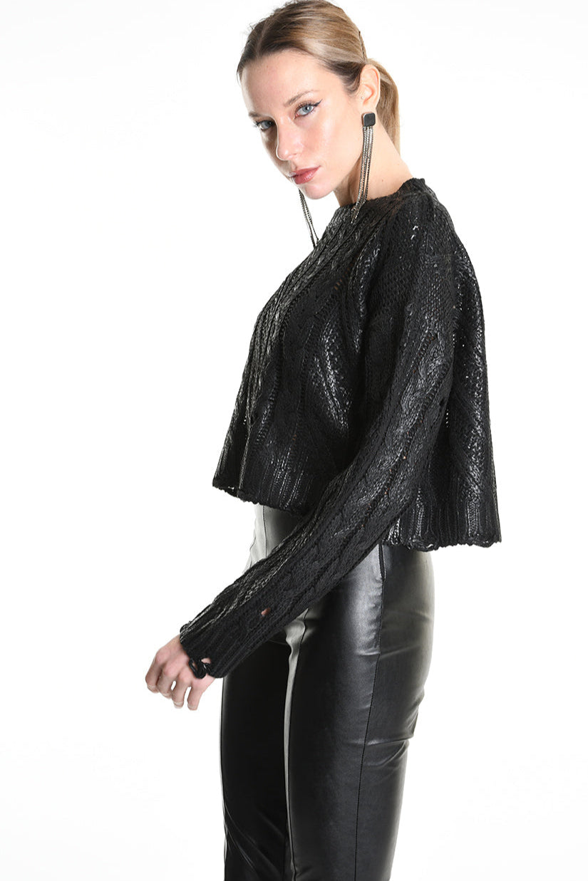 This black cropped cable-knit sweater, crafted in Italy with a fine gauge 3 yarn, combines style and texture through its braided design and unique coated finish with intentional breakages. Its tailored fit enhances your silhouette, making it a versatile piece for chic, contemporary looks. Modeled here in size XS, it suits those seeking a modern, edgy knitwear essential.