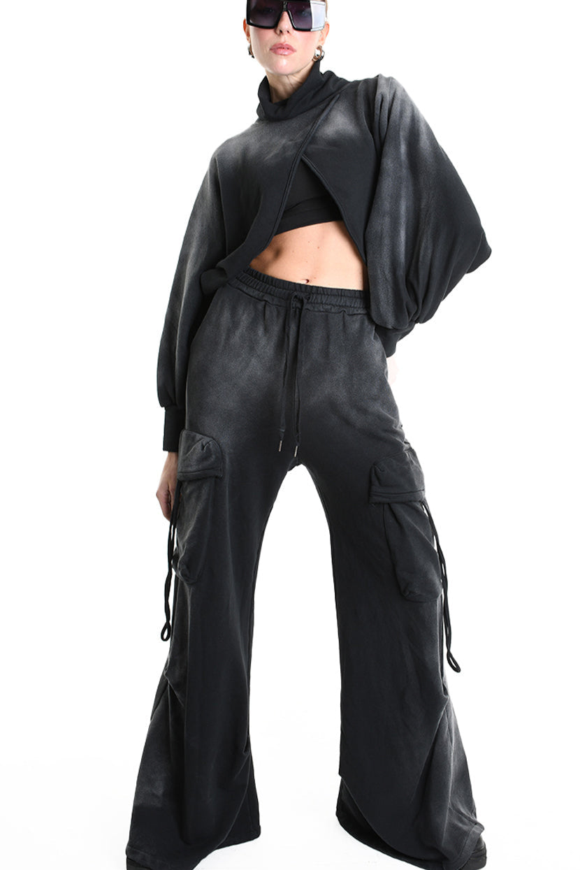 This 4V W5226 fleece crop sweater combines Italian craftsmanship with bold design. Made from 100% cotton with a corrosive dye treatment, it features an asymmetric cut, oversized sleeves, a high neck, and doubled cuffs for a distinctive look. Perfect for those seeking edgy style and comfort in one piece. Modeled in size XS on a 180cm tall frame.